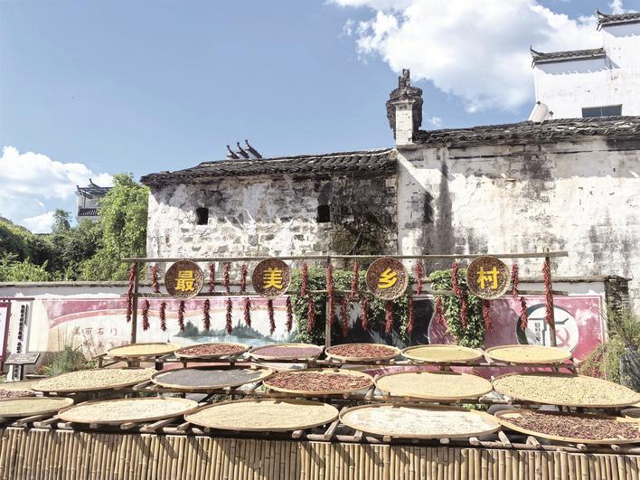 在石门村,自然风光与文化底蕴交相辉映。村内广场上,一排排晒盘盛满了红豆、玉米、辣椒等农产品,展现了婺源人传统的晒秋习俗。