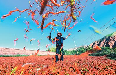 青海省海东市循化撒拉族自治县清水乡多滩地、谷地,全年日照充足,出产的线辣椒色泽鲜红,“香而不辣,口味独特”,受到大众喜爱。正是丰收时节,清水乡家家户户在房前屋后晾晒线辣椒,构成一幅喜人的秋日图景。
