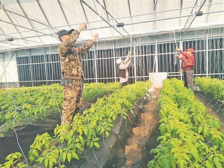 花卉基地里,菜农正在为西红柿绑绳搭架