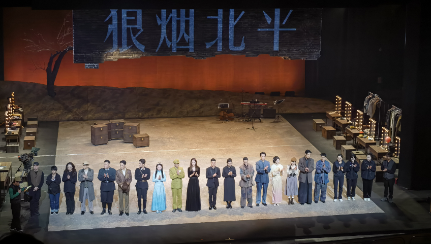 都梁“家国五部曲”系列包括小说《亮剑》《血色浪漫》《狼烟北平》《荣宝斋》《大崩溃》。此次《狼烟北平》的改编演出,有趣,好看,亦不乏对于革命与改良等“正统”问题的交锋对话。比如关于三民主义,女生在台词中有所涉及——认为“民生不应放在最后”,人民的力量不应被忽略。末场谢幕时,作为剧中的重要线索人物,人力车夫、北平“酒腻子”文三儿,一左一右携手中共地下党员方景林和国民党谍报人员徐金戈,一起向观众致意。