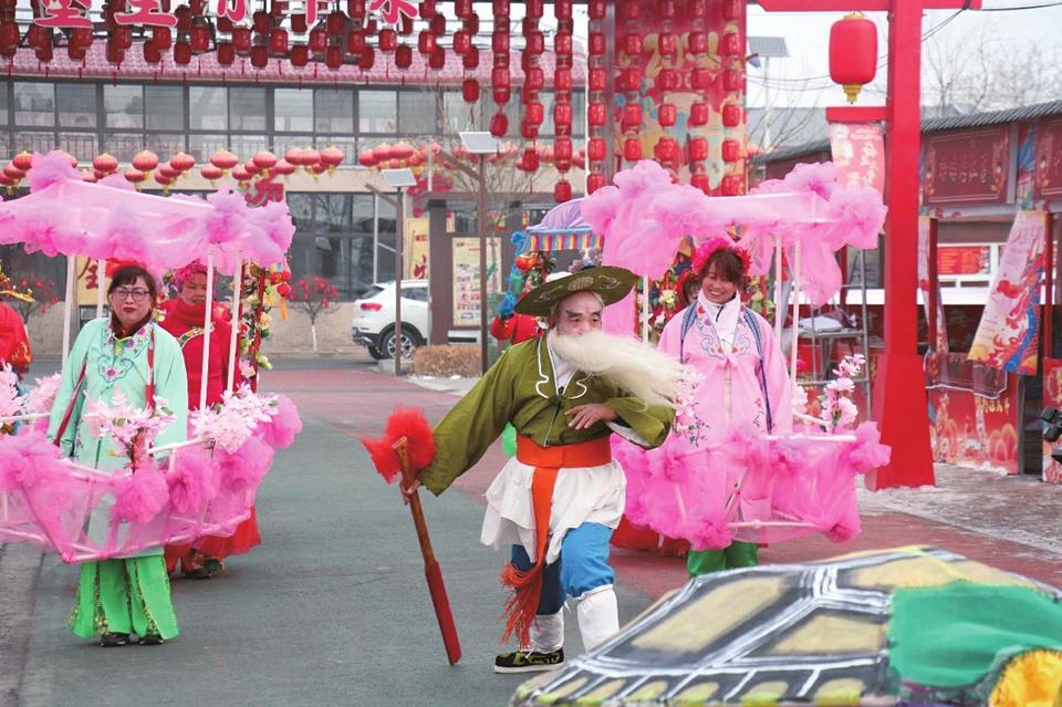 “堡里有年味·回村过大年”活动中,划旱船等表演深受游客欢迎