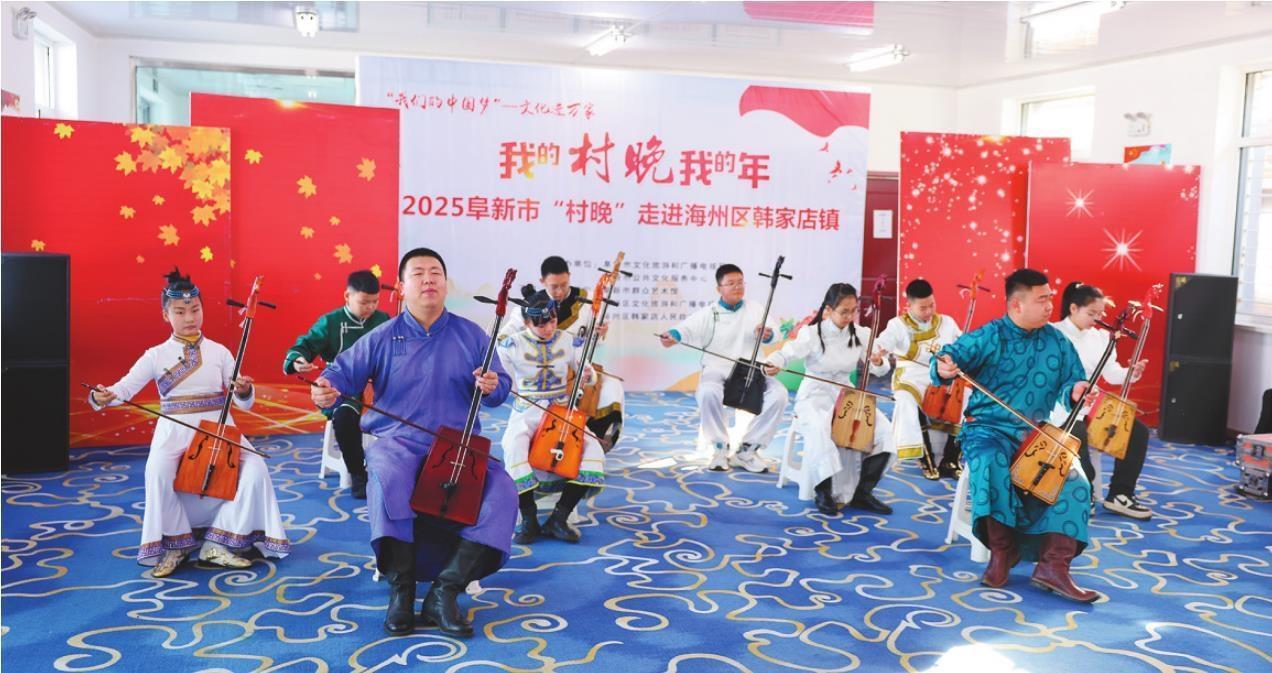 在阜新海州区高家店镇“村晚”上,马头琴齐奏《白马》(受访者供图)