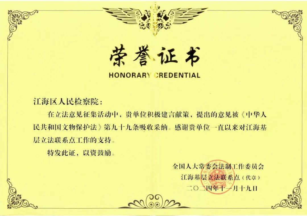 助力“法务集聚区”建设,落实“谁执法,谁普法”责任制,开展法律“六进”活动60余次。积极履行立法联系单位职责,对4部法律修订草案提出立法建议,其中对文物保护法提出的意见被全国人大常委会法制工作委员会吸收采纳。