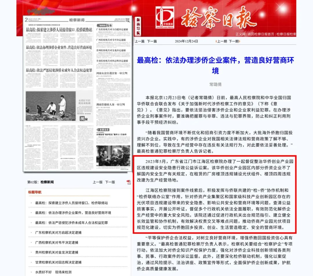 “督促整治‘侨梦苑’产业园区违规建设安全隐患行政公益诉讼案”被《检察日报》报道