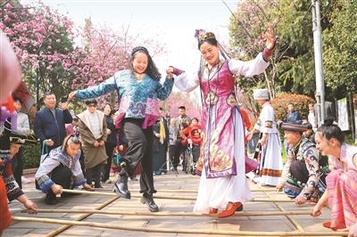 游客在云南省昆明市呈贡区洛龙公园体验竹竿舞。李发兴 摄