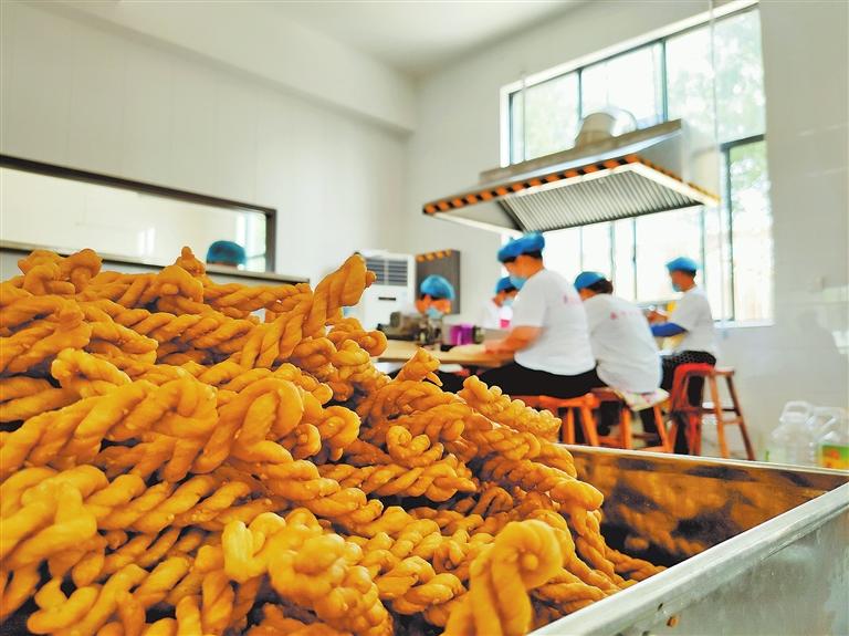 清晨五点半,晨曦中的河南省民权县王桥镇麻花庄村已飘起油香。作坊里,工人们麻利地将醒好的面团搓成长条,双手翻飞间,长条变成了一个个小麻花。油锅翻滚,麻花炸得金黄。