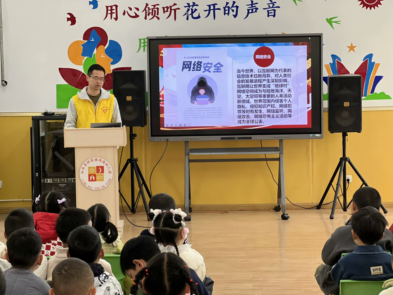 栟茶镇司法所工作人员陶亮摇身一变,成为了孩子们眼中亲切的“安全老师”。他充分考虑到幼儿独特的认知特点,巧妙地以动画《安全小卫士成长记》作为开场,瞬间吸引了孩子们的目光。紧接着,一场精彩的“小明守护国家秘密”情景剧上演,陶亮借此生动形象地为孩子们讲解诸如“不拍军事设施”“陌生链接不点击”等实用的安全常识。在随后充满趣味的“三问三答”互动环节中,孩子们积极踊跃,纷纷举手发言:“要是看到有人可疑拍照,一定要赶紧告诉警察叔叔!”“绝对不能为了一点零食,就把秘密随便告诉别人!”现场气氛热烈非凡,法治副校长陶亮对孩子们展现出的“国家安全小卫士”般的强烈责任感,不住点头称赞。