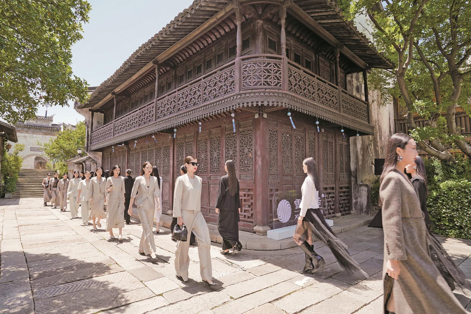 三面环水的水上禅堂是濮院时尚古镇的标志性景点之一,庄严肃穆的木结构大殿气势恢宏,等待或观赏一场时装秀的间隙,观众的目光总是被那些交错折叠的斗拱和完美契合的榫卯所吸引,和美轮美奂的时装秀碰撞、对话、交融,共同演绎着关于“美”的张力。