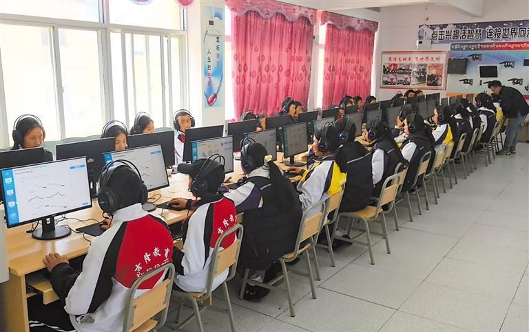 在日喀则市吉隆县中学新机房内,学生们头戴耳机跟随教师指令进行实操训练。