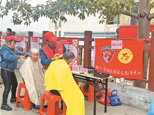 兴龙街道平浪村志愿者服务队在老区广场开展爱心义剪。(长洲区融媒体中心供图)