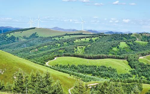 5月24日拍摄的丰宁满族自治县的森林和风电场。记者 陈宝云 摄