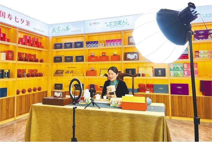 下营村村民正在直播间推介七夕美人茶产品。(受访者供图)