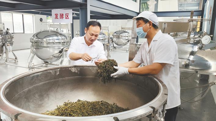 6月22日,湖北省十堰市郧西县涧池乡下营村,湖北七夕茶业生物科技有限公司生产车间。烘干机的高温慢慢蒸发掉茶叶的水分,车间里茶香氤氲。