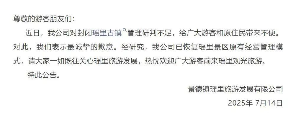 在村民的反对和舆论关注下,7月14日,江西省景德镇市瑶里景区发布公告称,近日,我公司对封闭瑶里古镇管理研判不足,给广大游客和原住民带来不便。对此,我们表示最诚挚的歉意。经研究,我公司已恢复瑶里景区原有经营管理模式,请大家一如既往关心瑶里旅游发展,热忱欢迎广大游客前来瑶里观光旅游。