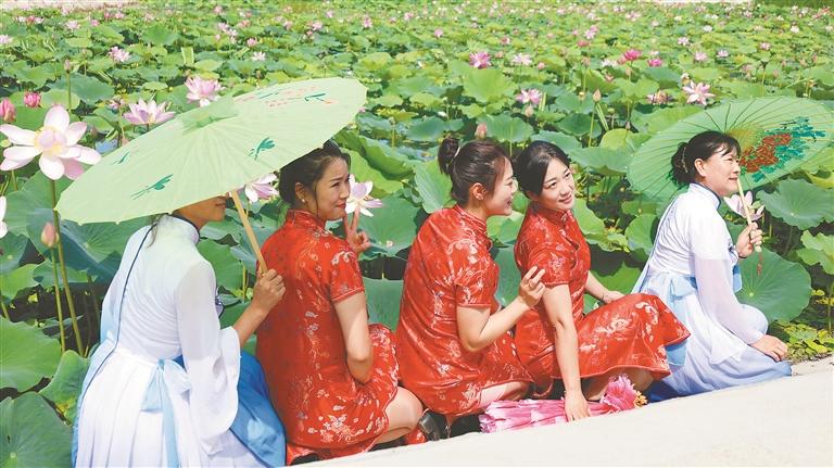 游客在荷花节上打卡拍照。