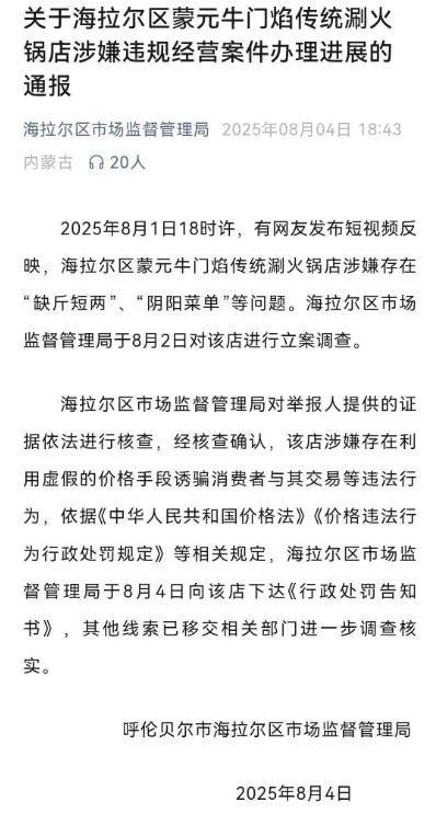 8月2日,海拉尔区市场监管局也展开立案调查。最新通报显示,8月4日,内蒙古呼伦贝尔市海拉尔区市场监督管理局针对涉事火锅店涉嫌违规经营一案向该店下达了《行政处罚告知书》。