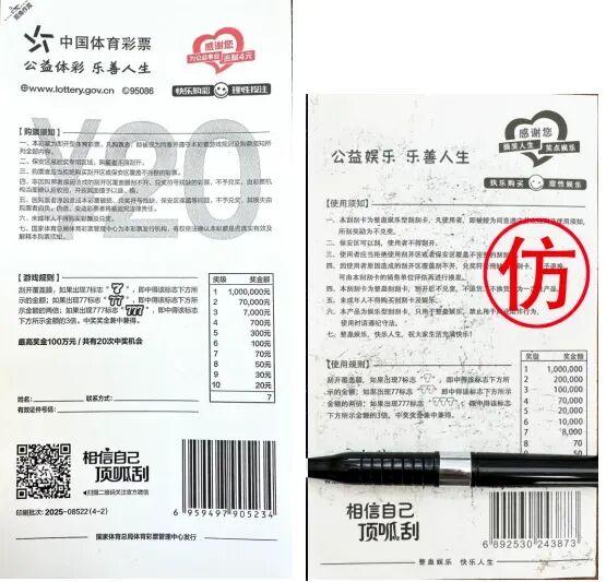 多地发生兑奖闹剧,上演了人生倍速版“大起大落”。这些“整蛊彩票”都以即开型体育彩票为主。正规合法的即开型体育彩票到底长啥样?根据国家体育总局体育彩票管理中心发布的声明,即开型体育彩票使用环保纸张和油墨,绿色、健康、易刮开; 保安区和刮开区均有覆膜,票面印有防伪装饰纹,图案完整;票面印有体彩+顶呱刮标识及面值金额,刮开后的游戏区域有防伪底纹,且游戏符号、奖金标志清晰易辨别。票背 印有发行机构、公益金贡献金额和官方网址等信息。