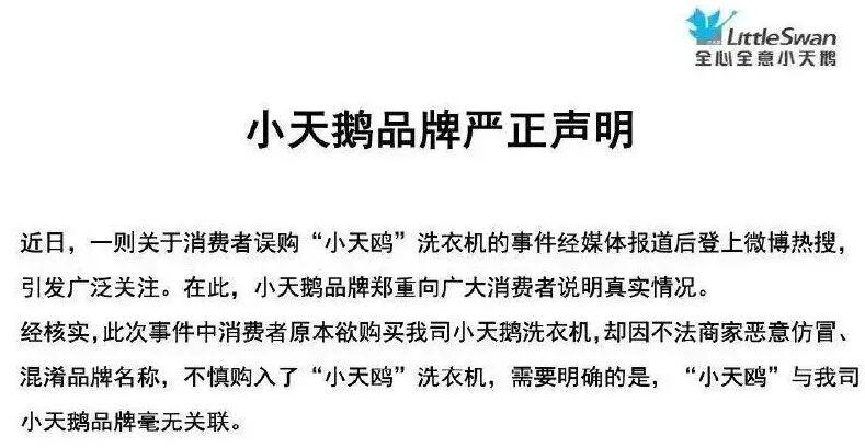 该事件迅速登上微博热搜,引发公众对品牌混淆现象的广泛讨论。随后,小天鹅官方发布声明直指不法商家“恶意仿冒、混淆品牌”,强调“小天鸥”与品牌无关联。声明称,已联合市场监管部门及电商平台调查取证,启动法律程序追责,同时提醒消费者通过官方渠道购买。