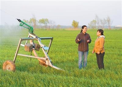 陈世君(左)为村民讲解小麦科学灌溉的知识。陈雷 摄