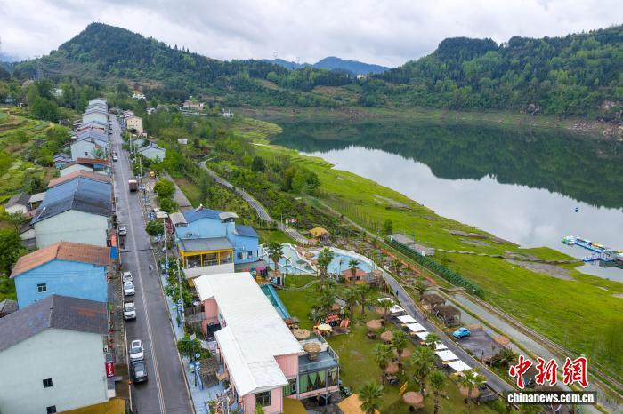 图为重庆石柱桥头镇长沙村,一排排精品民宿立于湖光山色间。中新网记者 何蓬磊 摄