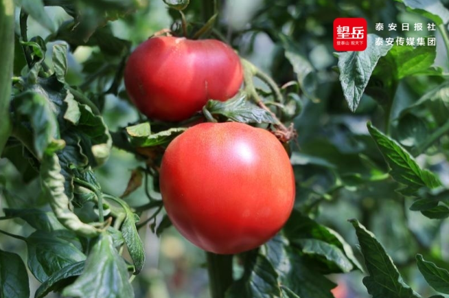 在山东省泰安市泰山区上高街道魏家庄村的上高庄园里,一排排冬暖式大棚鳞次栉比,走进番茄种植大棚,两米多高的番茄藤蔓顺着吊蔓架向上生长,绿叶间挂满了青红相间的果实,鲜红的番茄掰开后汁水丰盈、沙瓤饱满,果香扑面而来。