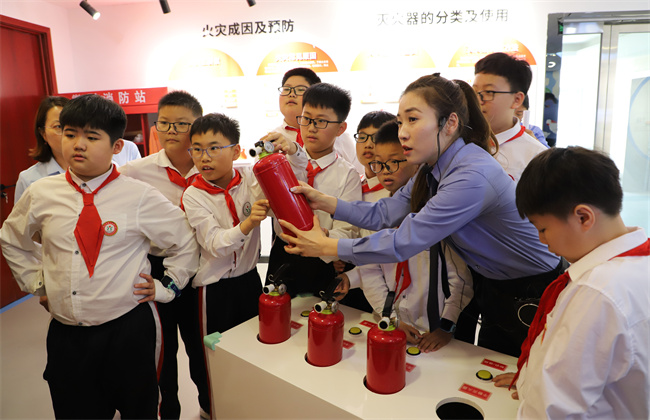 在商丘市检察院青少年法治教育基地,检察官向学生们讲解消防知识。