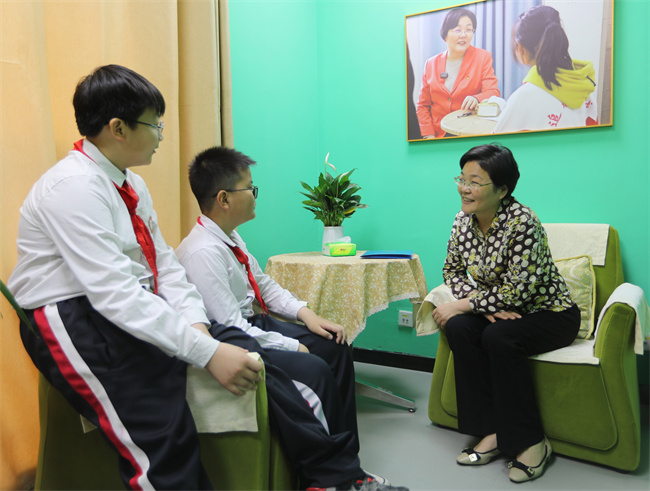 学生们在“牛妈妈”工作室与全国人大代表牛超(右)谈心。
