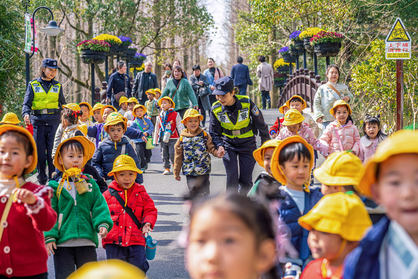 图为民警为春游的小朋友们提供服务。