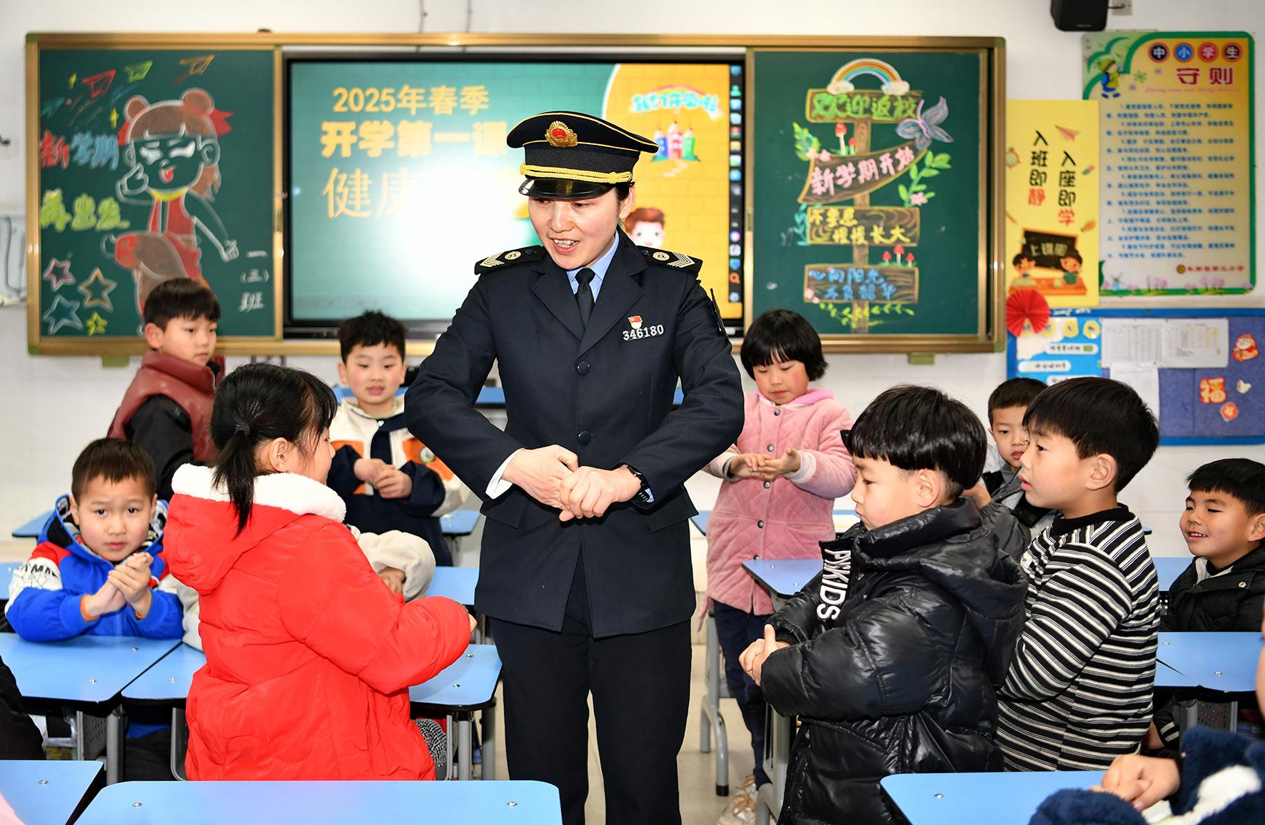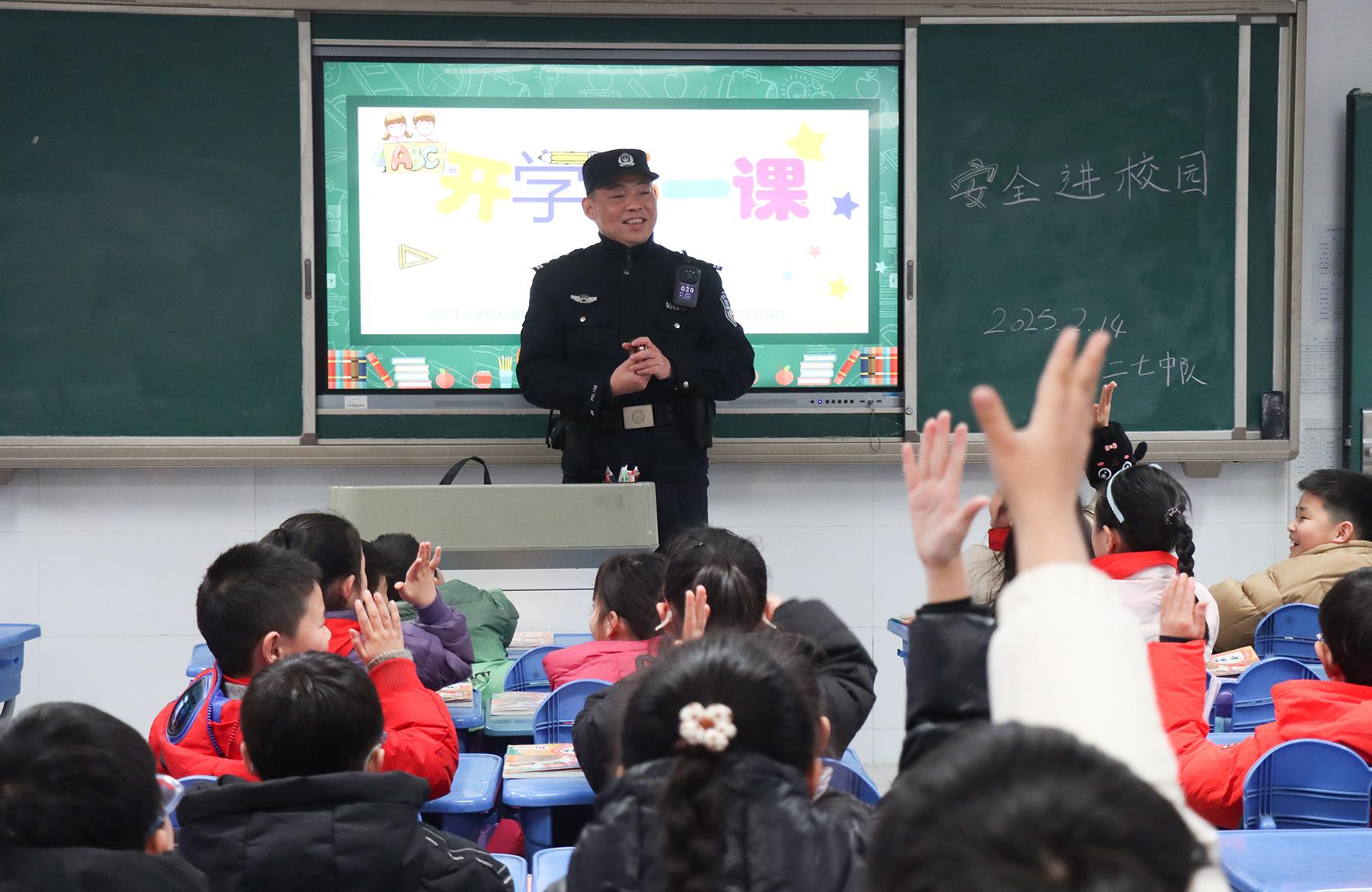2月14日,安徽省合肥市公安局瑶海分局大通路派出所组织警力走进辖区滁州路小学开展“开学第一课”活动。