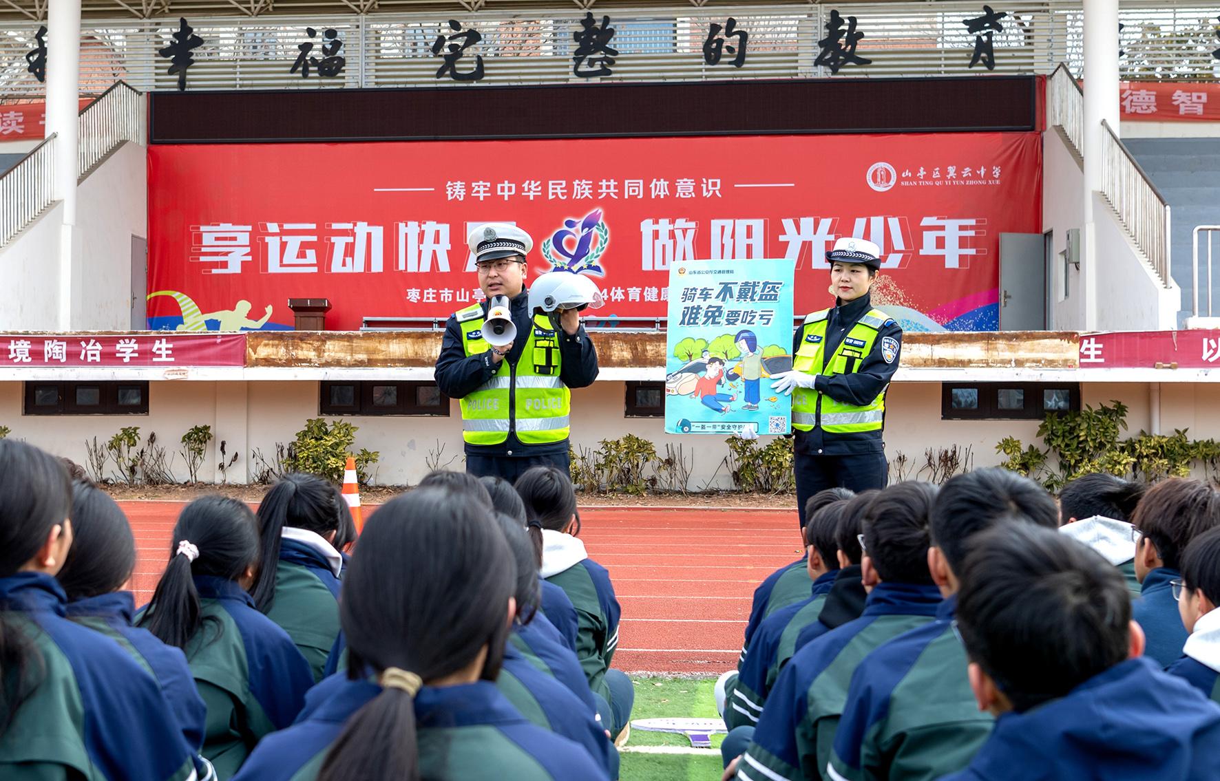 2月14日,山东省枣庄市公安局山亭分局交警大队组织民辅警走进辖区翼云中学,开展春季“开学第一课”交通安全宣传活动。