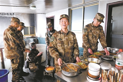 战士夏梦鑫兼任哨所的“大厨”,他喜欢和官兵交流做各地的家乡菜,把哨所厨房变成了一个融合东西南北中菜肴的“烹饪学校”。