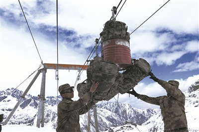 第二天上午,我们到达边防团九连,这里海拔3960米。一条索道映入记者眼帘,在连队蹲点的团长李广华正组织官兵通过索道给卓拉哨所“空运”给养。他告诉记者,这里的大雪封山期长达8个月,以前官兵每个月都要从山下连队往山上哨所背运物资,徒步攀爬经历了太多的艰辛和危险。去年这个时候,在各级领导机关的关心帮助下,卓拉哨所开通了运输索道,结束了近半个世纪运输物资靠“人背马驮”的历史,哨所官兵封山期吃菜难、饮水难等“老大难”问题得到有效解决。