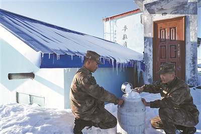上等兵吕胜超、林元就近取雪,准备为战友们烧洗脸水。