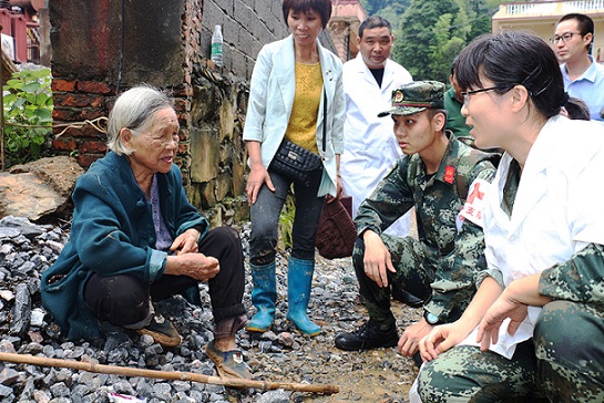 图为官兵正在向老人了解村子受灾情况。秦可 摄
