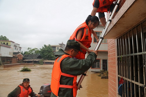救援行动立即展开,官兵们利用冲锋舟开抵灾区展开搜救,为节省时间,他们在浅水处徒步拖船开进,深水处驾舟开进,遇有被困人群第一时间为其穿上救生衣,并利用梯子、绳子等工具协助转移。