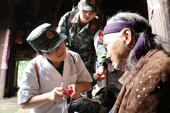 图为军医正在问诊患病老人。秦可 摄