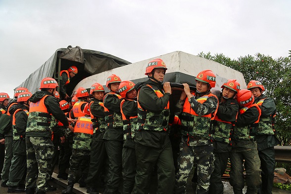 12日凌晨,完成险情处置的官兵受到在场县委县政府领导的高度赞誉:“关键时候还是武警官兵让老百姓放心”。