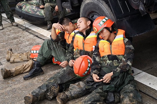 在连续15个小时的战斗中,尽管沉重的沙袋抗在肩上,官兵依旧神色如常,生龙活虎地奔跑在救援一线上,汗水抛洒在空中,滴落在重重的脚步下。附近的村民,看着忙碌得迷彩绿身影,纷纷送来食物和饮用水表示感谢。