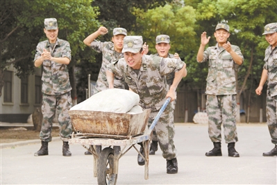 这些体验对年轻的官兵来说很新鲜。三班战士常博彦跃跃欲试,第一个握住了小推车车把。不料,他刚推出两步,只有一个车轮的小推车就开始左摇右晃,常博彦也差点被带倒。3圈下来,他便气喘吁吁。