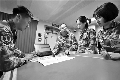 为做好气象保障,每天一早,气象小组学员都要来到海图室,打开气象传真机,在教员孙成志的带领下研究云图。