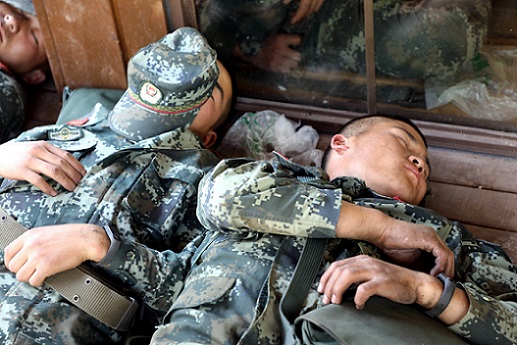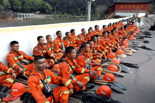 图为2020年4月1日,武警官兵完成西昌百花深沟烟点扑救任务就地休息。李结义 摄