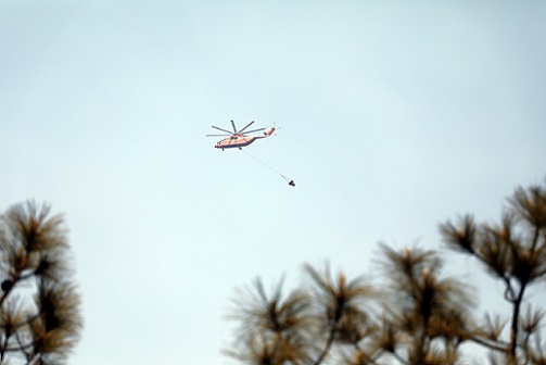 图为2020年4月1日,直升机在空中吊水作业。李结义 摄