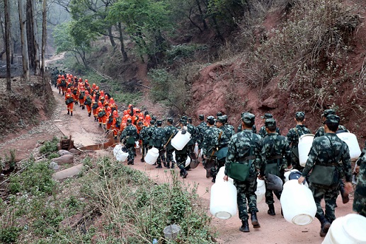 图为2020年4月1日,武警官兵携带装具登山扑灭烟点。李结义 摄