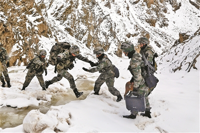 5月上旬,新疆克孜勒苏军分区迈丹边防连官兵前往海拔4000多米的某点位开展例行武装巡逻,加大对高海拔防区的执勤管控力度,确保边境安全稳定。图为官兵协助越冰河。