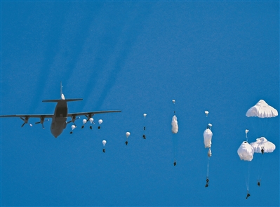 10多分钟后,第一批运输机编队抵达伞降空域。在先遣侦察引导队的引导下,官兵依次鱼贯跃出机舱。瞬间,朵朵伞花在晨曦微露的天空绽放。