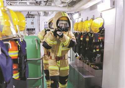 “后机舱起火!”刚刚处置完“敌”情,成都舰又遇险情。战救小组人员迅速切断电源、提取灭火器、铺放水龙带……
