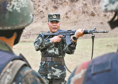 雁门关外微寒,夜雨渐迷人眼。褚旭亮一手托枪,一手指向靶标,向身后士官骨干讲解示范哨兵执勤射击技巧。
