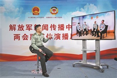 本报记者孙兴维通过视频连线方式采访军队人大代表。本报记者 范显海 摄