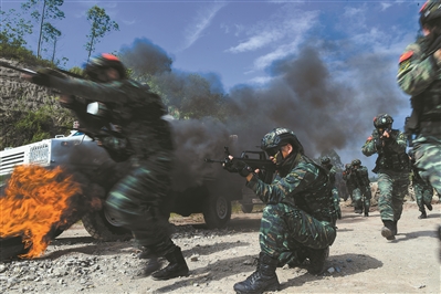 “一小队进行攻心谈判,稳定‘暴恐分子’情绪;二小队两个突击组沿涵洞两侧小路迂回包抄;狙击组占领制高点,对现场进行监控……”指挥员下达行动命令,特战队员相互掩护交替前进,消失在山林之中。