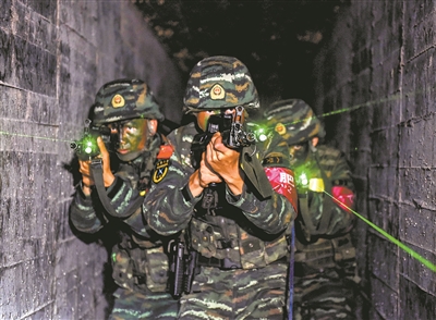 武警合肥支队特战小队官兵研究地形后,决定采取“正面佯攻、侧翼突入”战术实施捕歼。封控小组分别从两个方向隐蔽接近洞口,防止“暴恐分子”逃脱。突击组官兵携警犬进入山洞后,以迅雷不及掩耳之势进行突击,迅速将“暴恐分子”制伏。